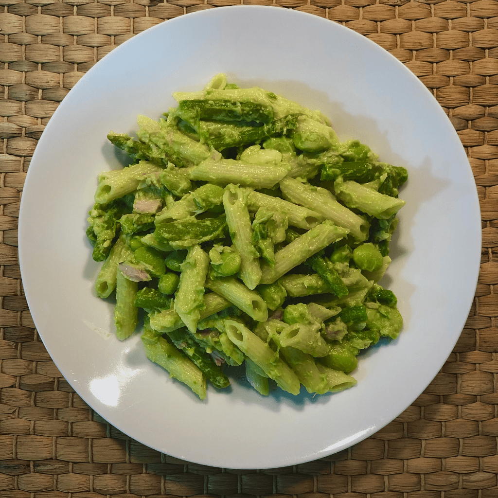 - Para 2 buenas raciones: Cocer 1 manojos de espárragos troceados y una 1/2 de edamames. Cocer 150g de pasta. Para la salsa de aguacate, triturar 1 aguacate con un buen chorro de AOVE, zumo de limón, sal y pimienta. Añadir una lata de atún.