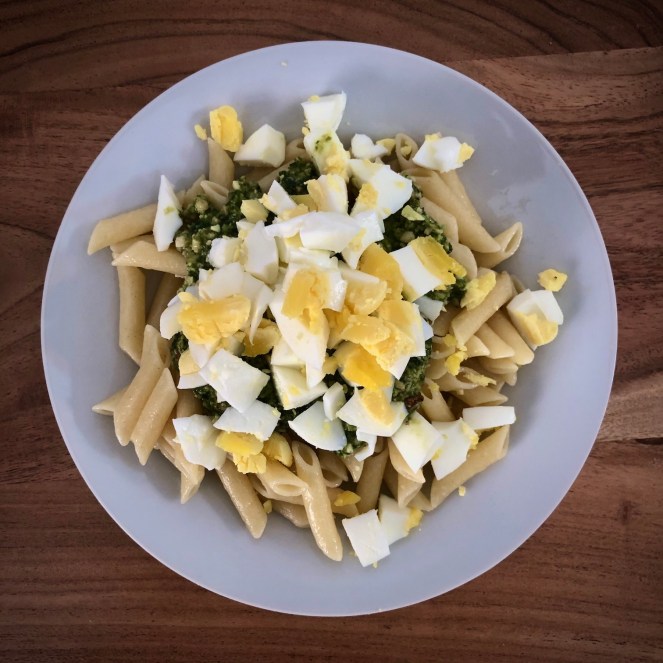 Pasta con pesto y huevo: