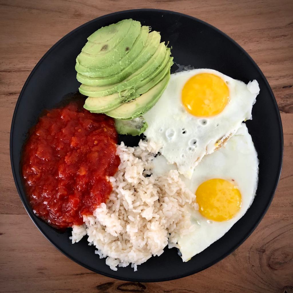 Esta receta va sin receta: lo que veis en el plato (arroz blanco, tomate frito, huevo y aguacate), eso es la receta. Podéis variarla a vuestro gusto