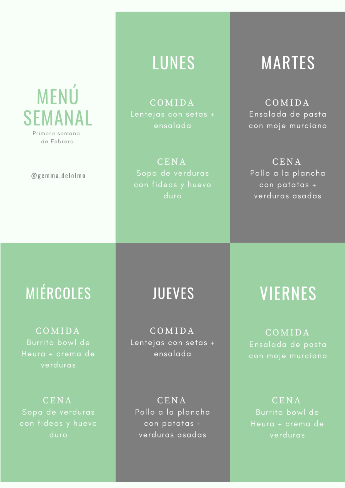 Por fin ha pasado Enero, el mes de la vuelta al trabajo y la rutina, y llega Febrero 💖 Esta semana os traigo un menú bastante sencillo, con un par de elaboraciones tan sencillas que van sin receta. Para el frío: Lentejas con setas y sopa de verduras con huevo duro Un par de ensaladas: Burrito bowl de Heura y ensalada de pasta con moje murciano Y un sencillo pollo a la plancha con patatas 😋