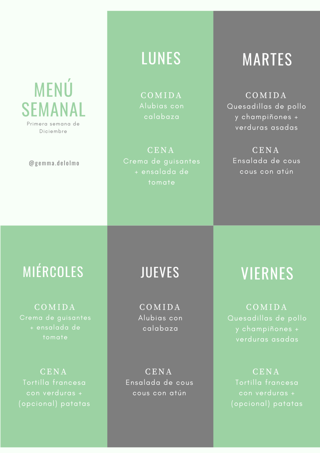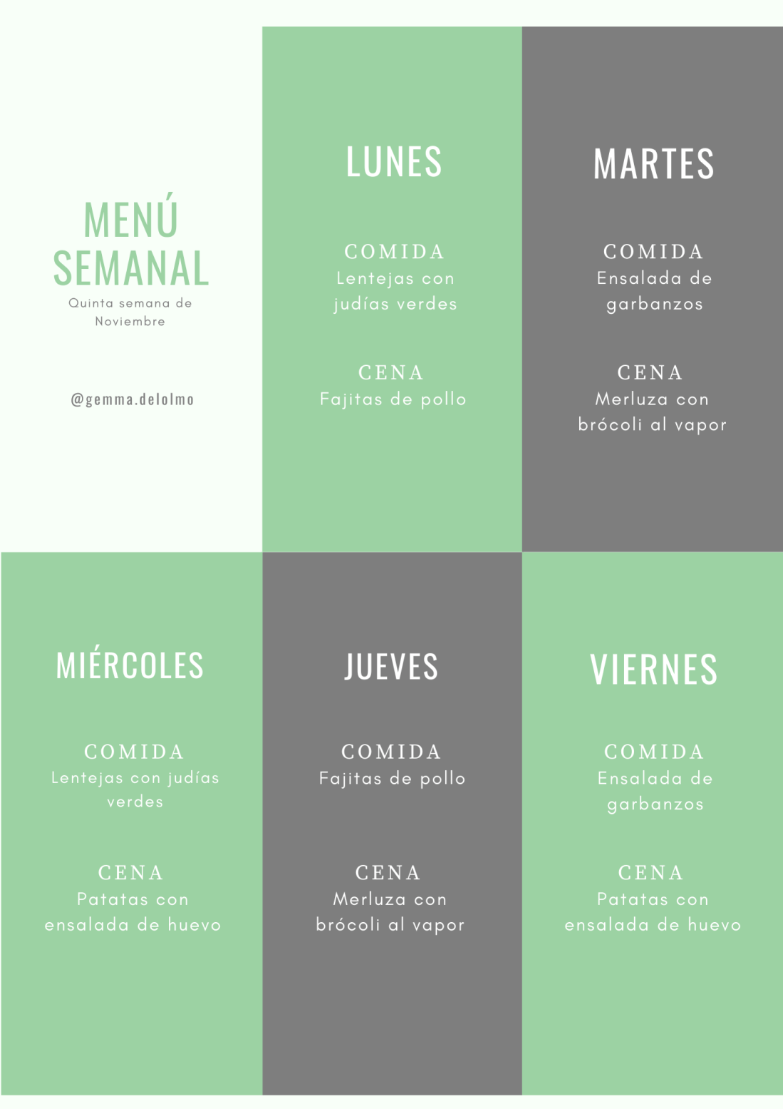 ¡Feliz Sábado! Ya casi está aquí Diciembre, el mes del turrón 🙈. Pero para nosotras que somos gente sana, aquí traigo un menú para seguir cuidándonos y hacer pocas excepciones. Algo de cocina internacional: unas ricas fajitas de pollo y unas patatas con ensalada de huevo Recetas muy sencillas: Ensalada de garbanzos y merluza con brócoli al vapor Y unas lentejas con judías verdes para quitarnos el frío con un buen guiso 😊
