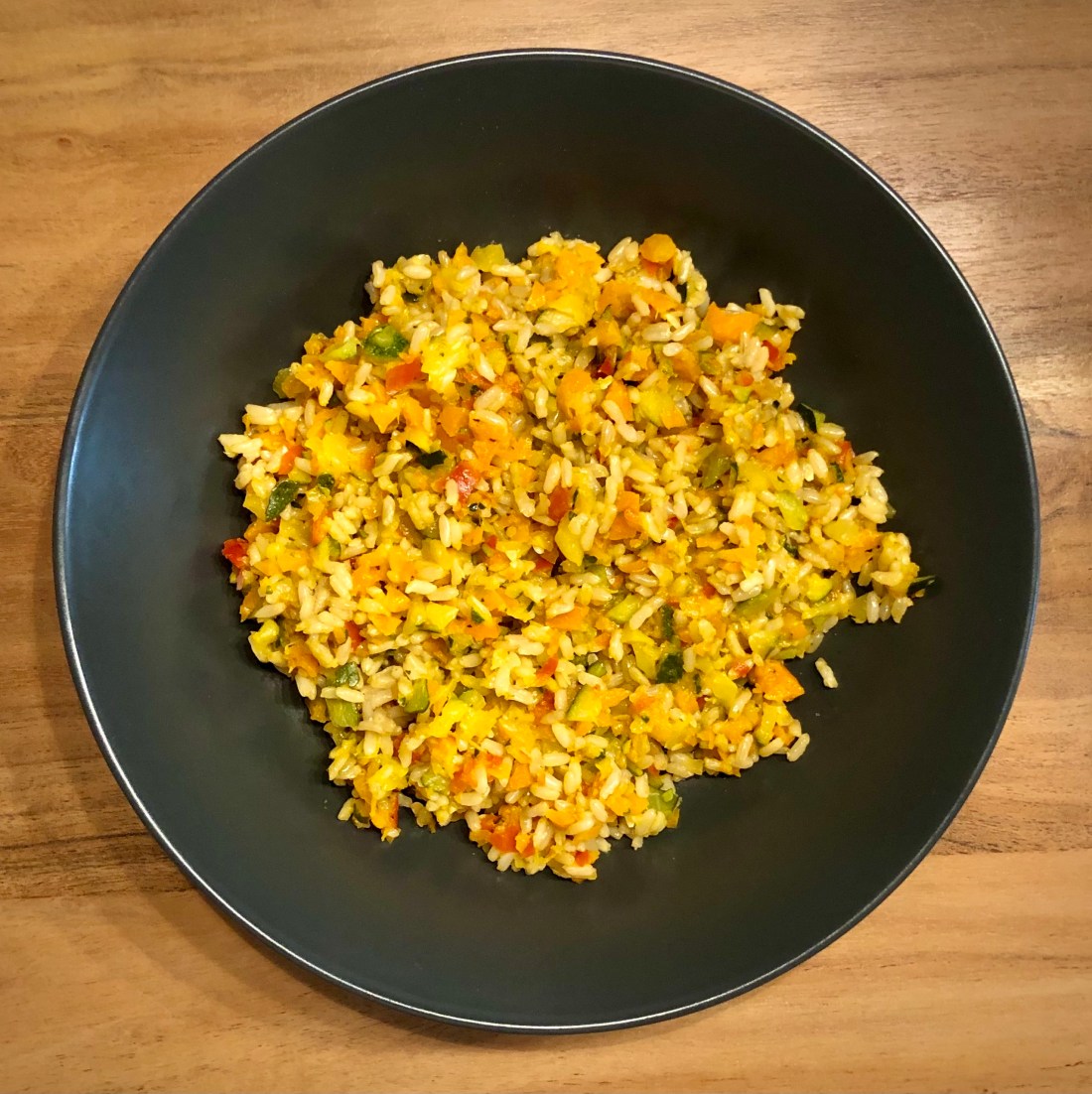 Os dejo una receta de guarnición con pocos ingredientes, y que además podéis variar con las verduras que tengáis de sobra. En casa la hacemos bastante a menudo ya sea con arroz, cuscus, quinoa… Y es que queda bien con casi cualquier cosa. Anoche la acompañamos con huevos.