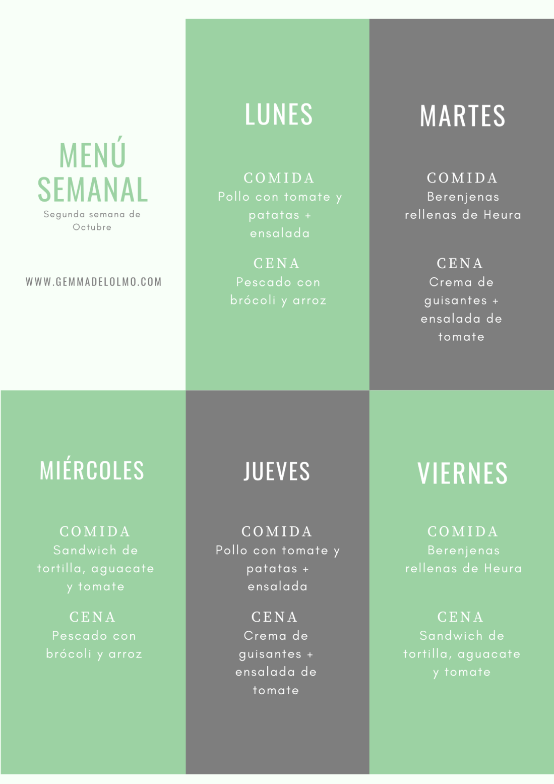 ¡Por fin está aquí un nuevo menú semanal! Además le he dado un nuevo formato. Esta semana tenemos pollo con tomate, crema de guisantes, berenjena rellena... y un par de platos para preparar al momento.