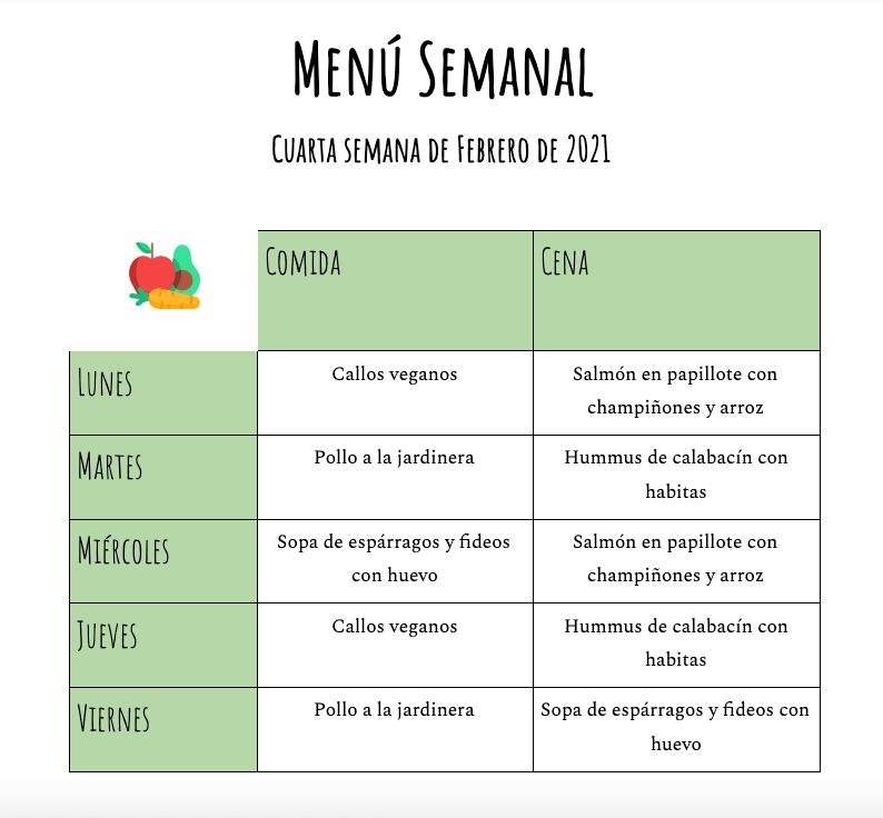 Esta semana me he retrasado un poco con el menú, no he podido publicarlo el fin de semana porque hemos tenido mucho lío en casa, pero aun así os lo dejo por aquí, y podéis guardarlo para otra semana, o para coger ideas.
