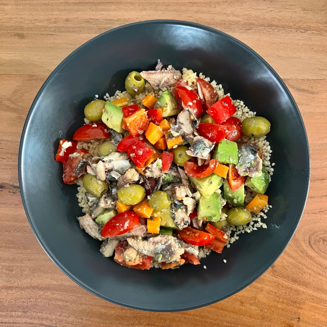 Una ensalada rapidísima, ideal para llevar y con mucha proteína y grasas saludables. Descarga aquí la receta para imprimir Ingredientes (para 2 raciones):▪️ 120g de cous cous▪️ 2 latas de sardinas en aceite de oliva▪️ 12 tomates cherry▪️ 1 aguacate▪️ 4 zanahorias▪️ Aceitunas Preparación:🔹 Mezcla el cous cous con 240g de agua hirviendo y una … Sigue leyendo 🥗 Ensalada de cous cous con sardinas 🐟
