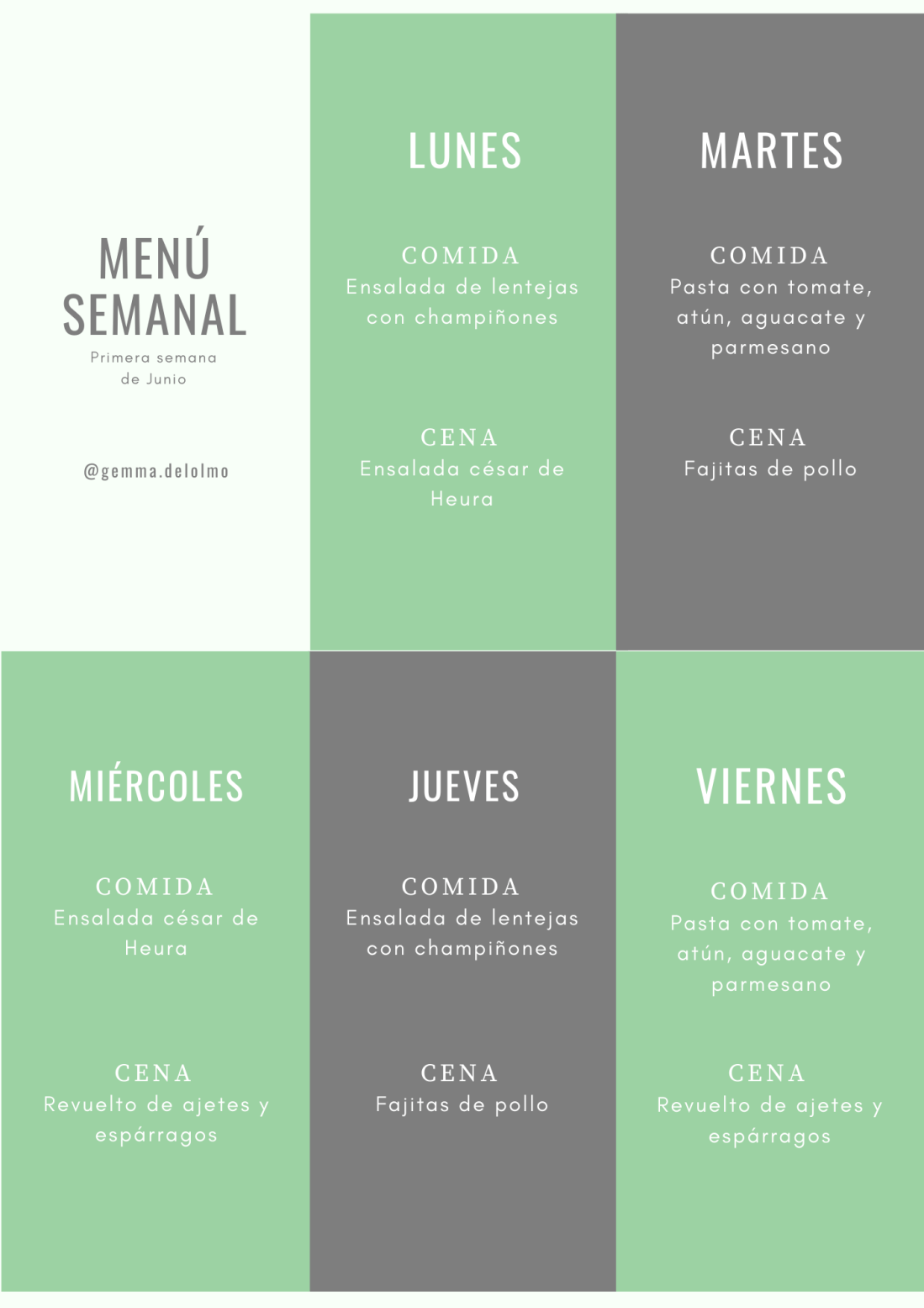 Los platos de esta semana: Dos ensaladas bien fresquitas para el verano, y llenas de proteína vegetal: Ensalada césar de Heura, y de lentejas con champiñones Otro plato de pasta para combatir el calor: Pasta con atún, tomate, aguacate y parmesano Y dos platos bien sencillos y cargados de verduras: Revuelto de ajetes y espárragos, y fajitas de pollo