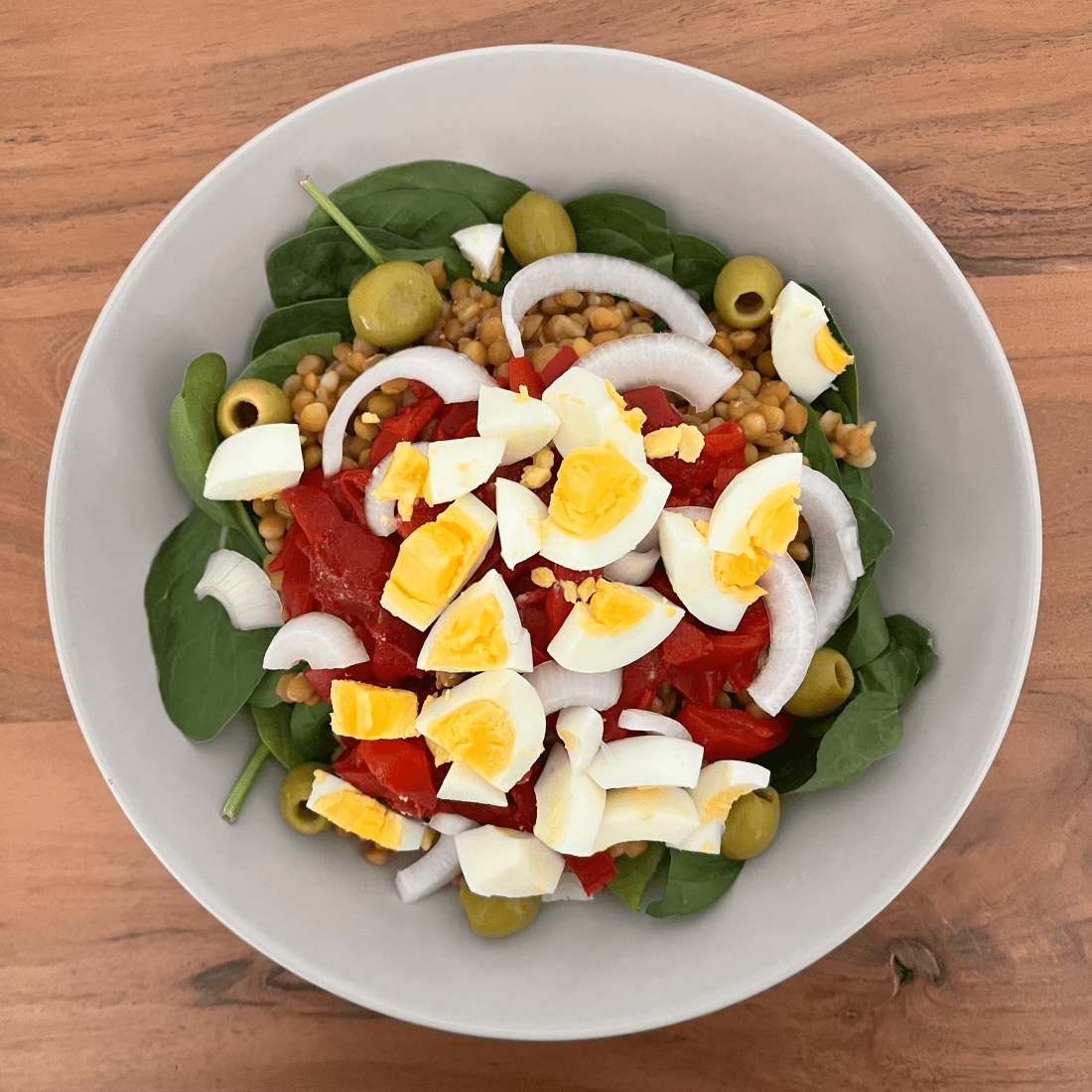 🥗 Ensalada de lentejas con espinacas, pimiento asado y huevo 🌶️