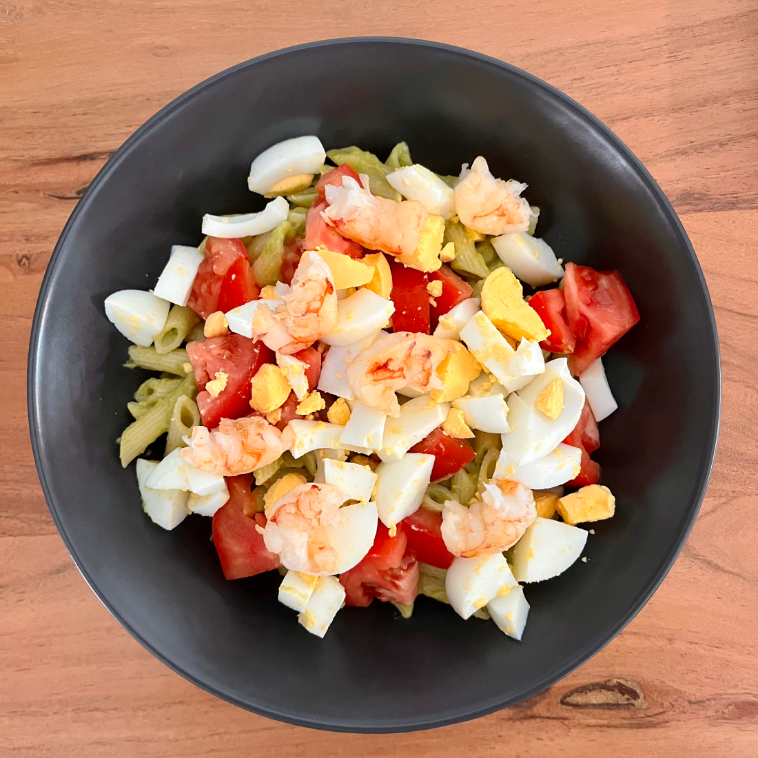 🥑 Pasta con salsa de aguacate, huevo duro y gambones 🦐