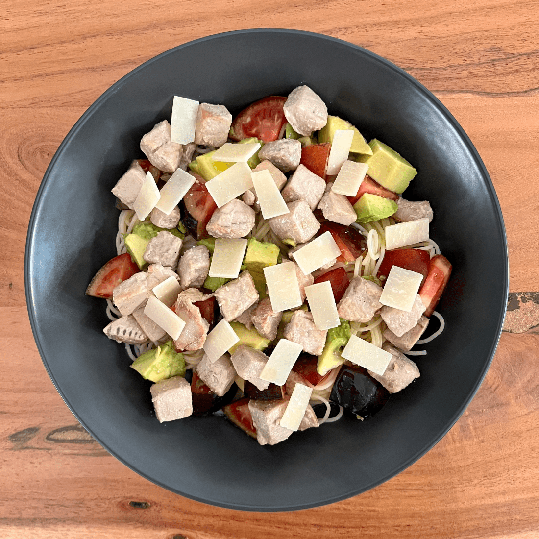 🐟 Pasta con tomate, atún, aguacate y parmesano 🥑