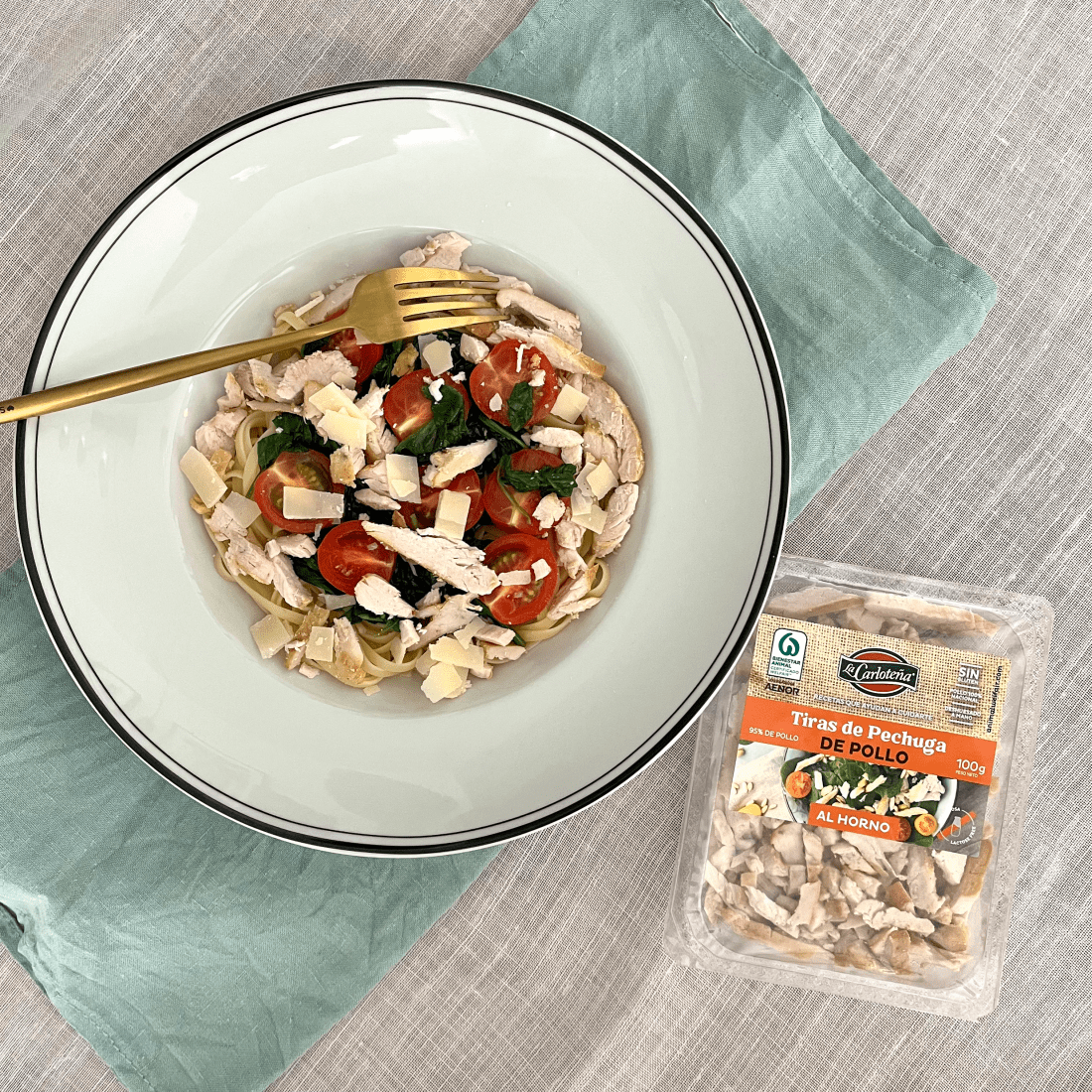 🍝 Pasta con tiras de pollo, espinacas y tomate 🍗